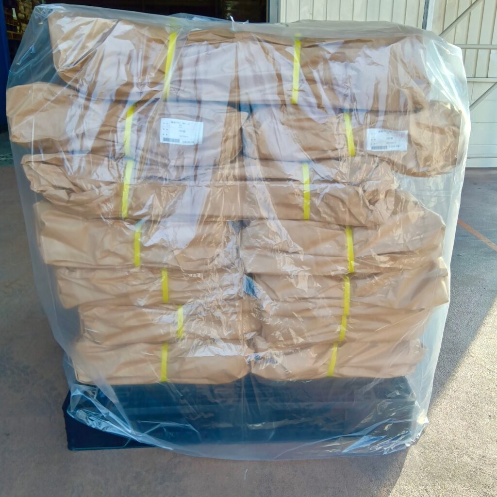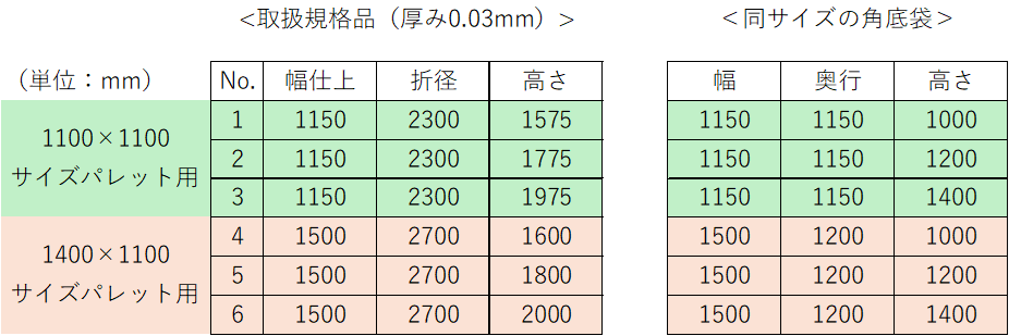 小ロットでの購入をしていただけるように、1100×1100サイズや1100×1400サイズのパレットに積んだ製品を保護するのに最適なサイズの規格品を取り扱っております。